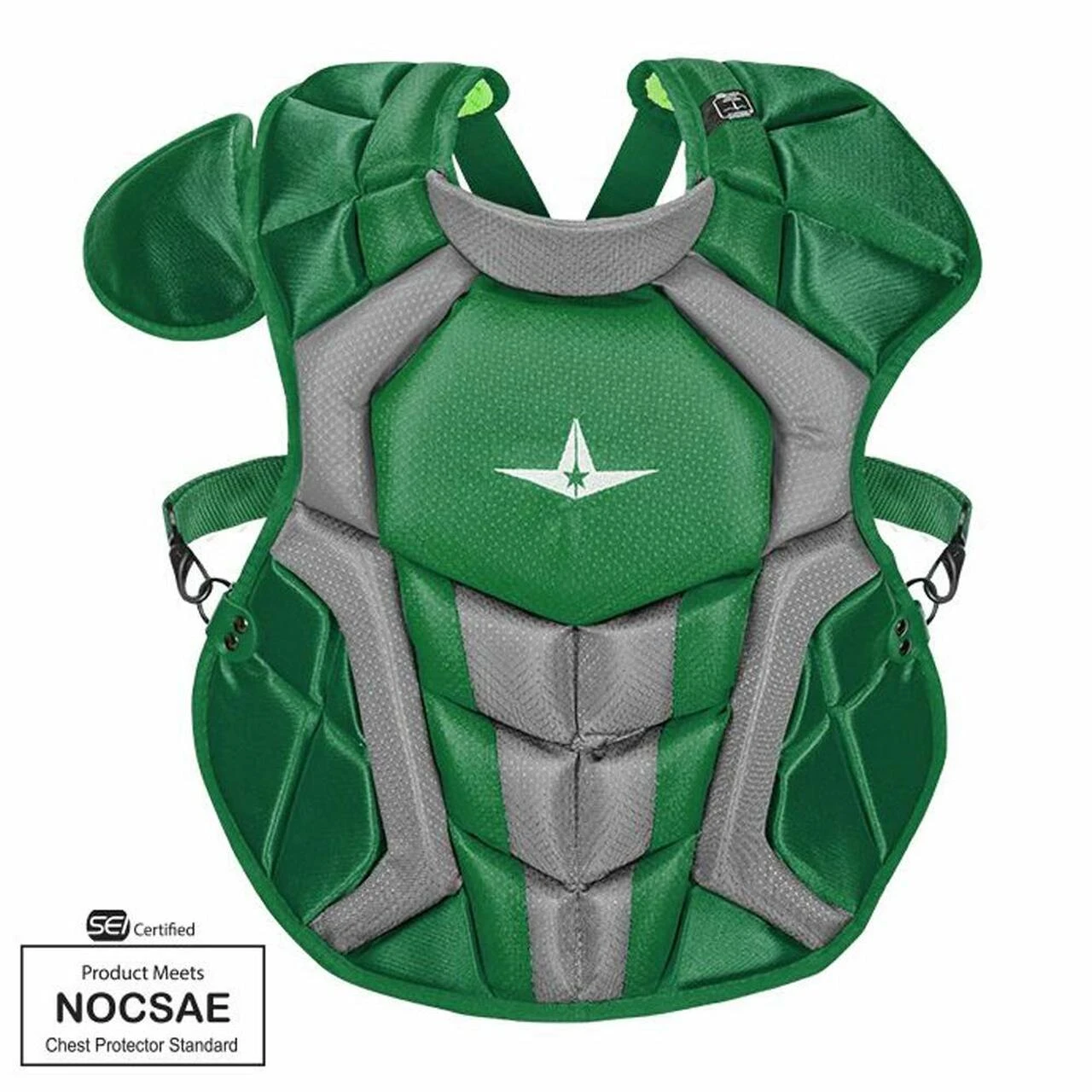 Intermediate 15.5 inch length. All-Star has developed chest protectors which are certified by SEI to meet the new NOCSAE standard for protection again commotio cordis. This rare, but very dangerous condition can result from a blunt impact to the chest causing cardiac arrest. Products that meet the new NOCSAE standard have been shown to significantly reduce the risk of this occurrence. NFHS will require use of certified chest protectors starting January 1, 2020 and adoption dates by other leagues are still pending.