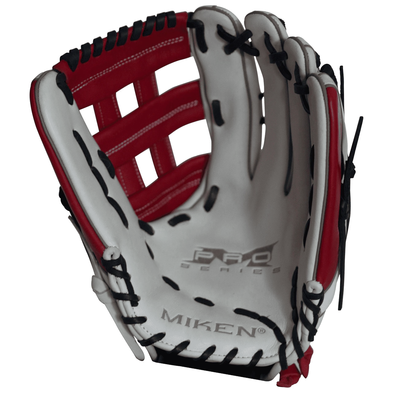 Miken Pro Series 14″ slow pitch softball glove features soft, full-grain leather which provides improved shape retention and a great, game-ready feel. The Pro H Web pattern is an extremely strong web that provides ball snagging functionality, and the PORON XRD palm padding has been added to drastically reduce ball impact to your hand.
